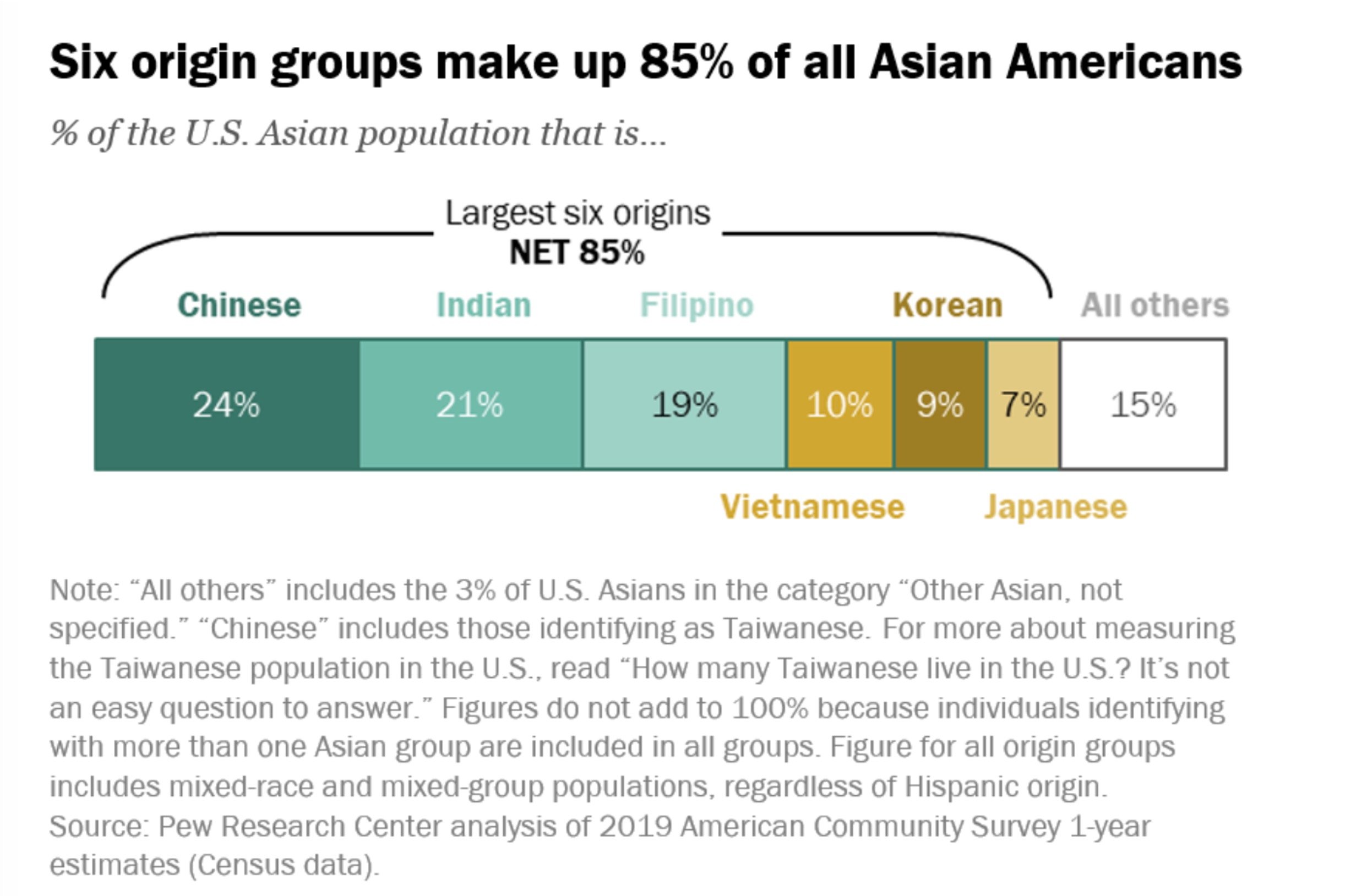 Within the US, around six origin groups make up 85% of all Asian-Americans:
